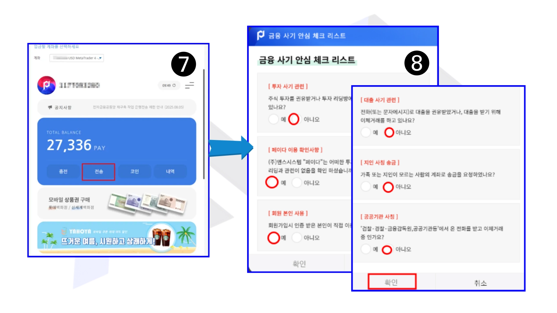 * (8)에서 금융사기 예방을 위한 안심 체크리스트 확인 절차가 진행되며,