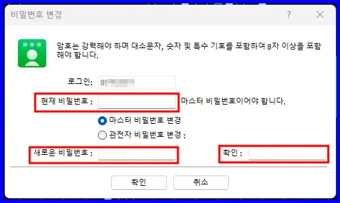 새로운 비밀번호 와 한번 더 확인 후 [확인] 버튼 클릭