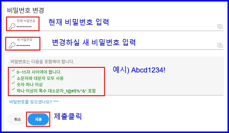 [비밀번호 변경] 에서 [현재 비밀번호]를 입력하시고 하단에 [새 비밀번호] 를 입력하여