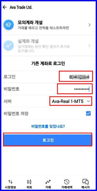 데모계좌번호로 로그인시 서버는 Ava-Demo 1-MT5 로 선택하셔야합니다.