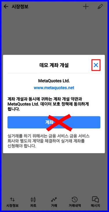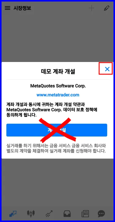 [데모 계좌 개설] 창에서 X를 눌러 창을 닫은 후 보이는
