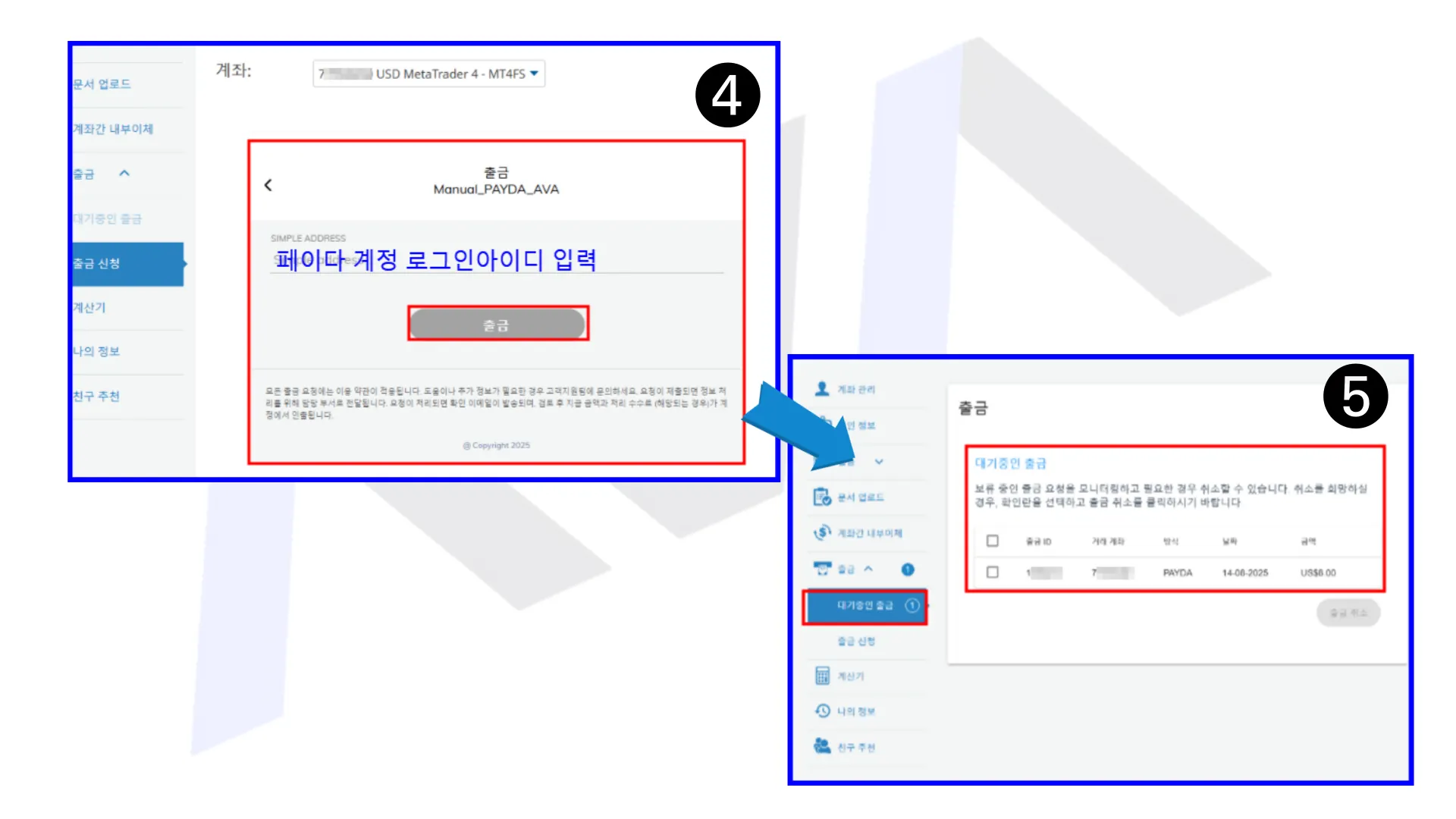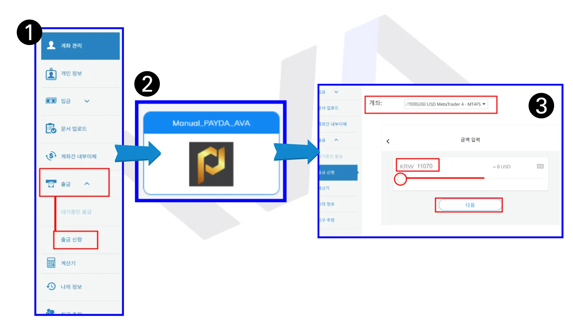 아바트레이드에서 출금신청 후 금액이 페이다로 전송됩니다.