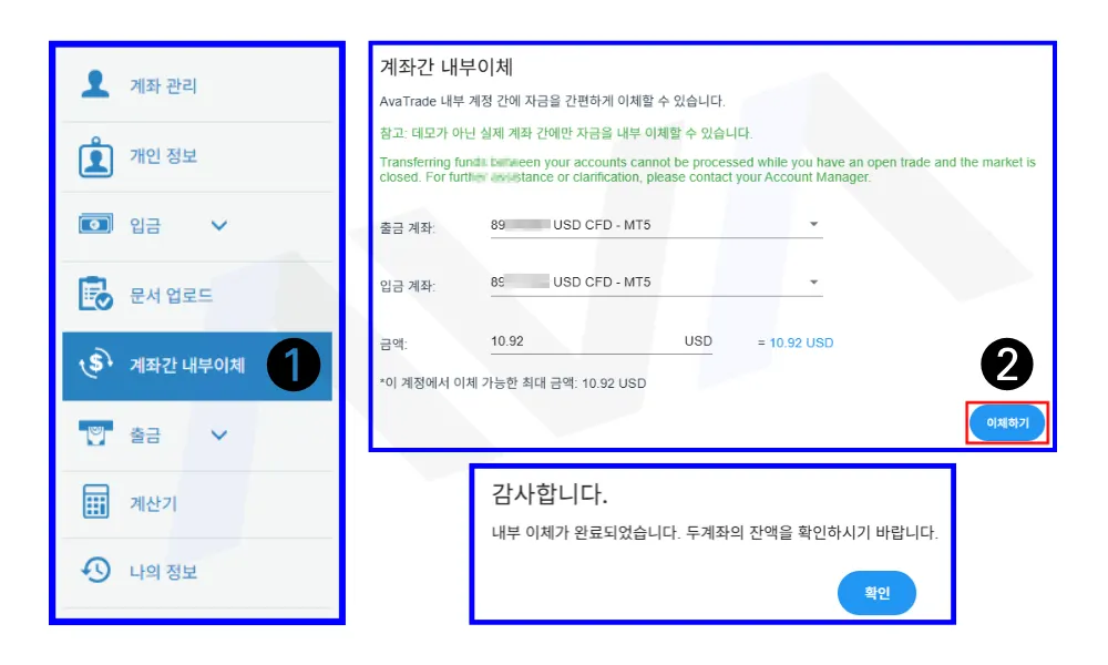 내부이체는 내 계좌 간 잔액을 즉시 이동하는 기능으로, 출금 없이 빠르게 계좌 변경이 가능합니다.