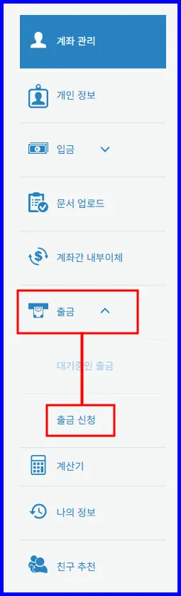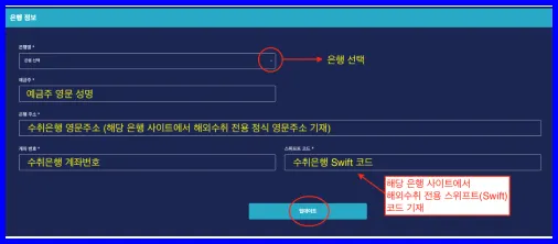 [출금신청] 메뉴에서 위 안내사항에 따라 정보를 입력한 뒤 [확인] 버튼을 눌러주세요.